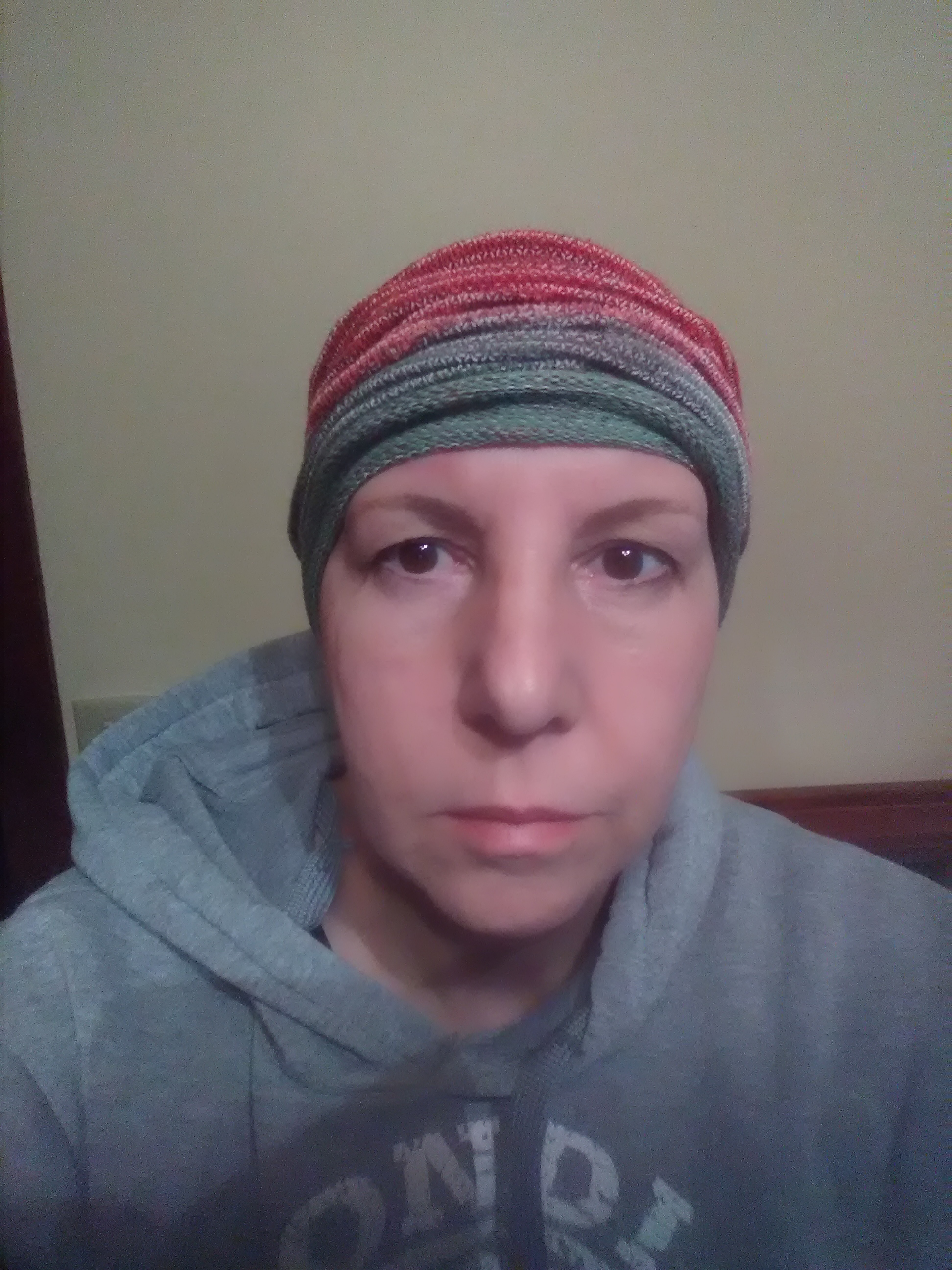 I’ve lost most of my hair except for a fine fuzz and most of my eyebrows and eyelashes – not happy about the bald-faced, chemo-turtle look… I don’t go out of the house without drawing my eyebrows on, but it’s getting harder to follow the lines.  I’ll be doing that for awhile yet as this chemo regime is also hard on the hair.  But I do have some fun with the wigs and scarves.  I was at my rehab exercise place the other day and one of the physios didn’t recognise me.  She worked out that it was because I had a different brightly coloured cap on than the last time she saw me.  I told  her that without hair, I didn’t have to keep the same look every day and could mix it up a bit.  I tend to only use the wig when I’m “out in public” – scarves and beanies the rest of the time and nothing at home unless my poor head gets cold.